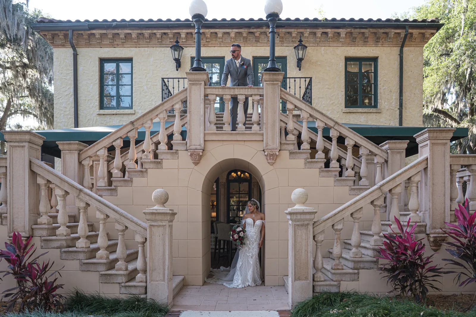 The river terrace faces west over the St. Johns River—perfect for sunset portraits. The grand staircase interior gets beautiful afternoon window light.